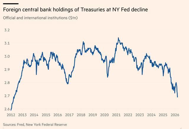 伊朗战争爆发后,多国央行大举抛售美债以支付高价原油、支撑本币,纽约联储托管的美债规模锐减至2.7万亿美元,创下2012年以来最低水平。